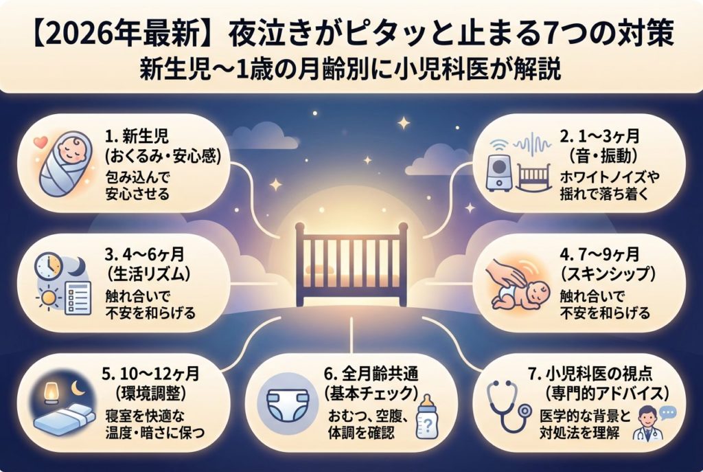 【2026年最新】夜泣きがピタッと止まる7つの対策|新生児〜1歳の月齢別に小児科医が解説