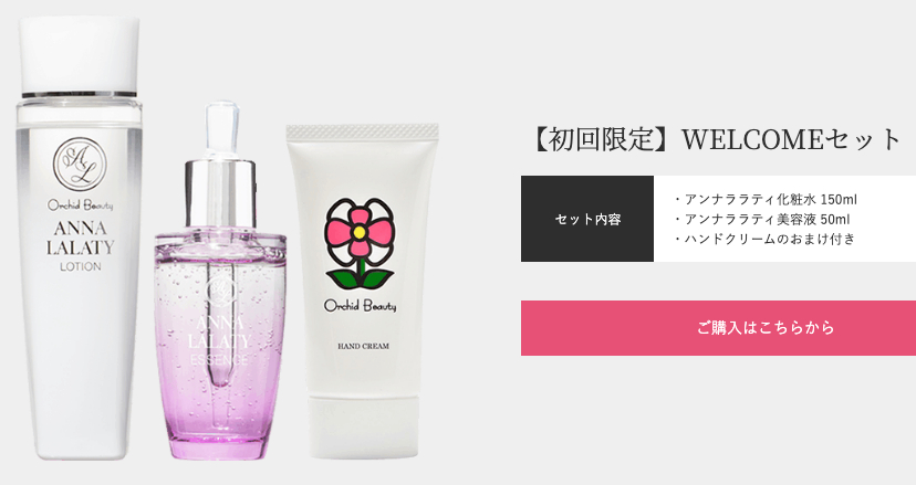 | オーキッドビューティーWELCOMEセット | 化粧水150ml、美容液50ml、ハンドクリーム | 9,570円 | 初回限定のお得なセット。肌の基本ケアをサポートします。 |
