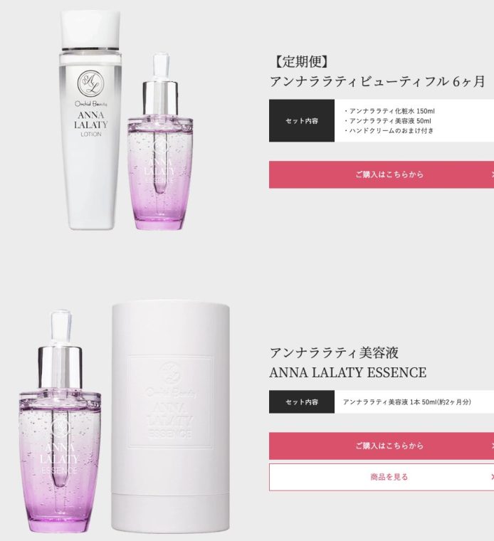 | アンナララティビューティフル定期便(6ヶ月) | 化粧水150ml、美容液50ml、ハンドクリーム | 価格情報なし | 定期的にスキンケア製品をお届け。継続的な肌ケアをサポートします。 |