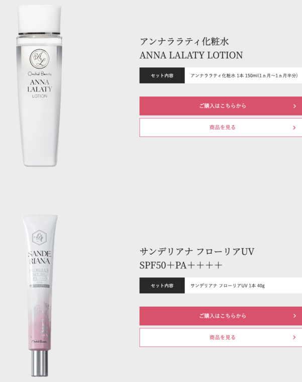 | アンナララティ化粧水 | 150ml | 5,400円 | オーキッドエキス配合の保湿化粧水。肌に潤いを与え、柔らかく整えます。 |