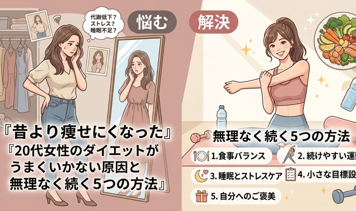 この記事では、20代女性が「昔より痩せにくくなった」と感じる科学的・生理学的な原因を徹底解説します。そして、無理なく日常に取り入れられる5つの実践的な方法もあわせてご紹介します。「これだけ読めば十分」と感じていただけるよう、専門的かつ実用的な情報を網羅しました。最後まで読んで、自分に合ったダイエットの正解を見つけてください。