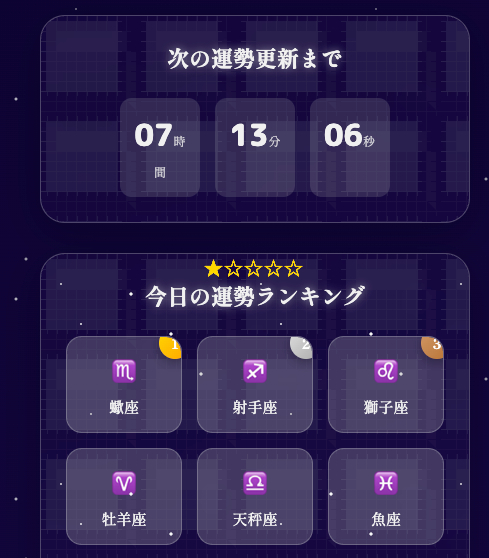 恋愛・結婚・仕事・金運など、気になる運勢を今すぐ無料占いでチェック!人気の占い師監修の診断や星座占い、タロット占い、姓名判断など多彩な無料占いを厳選。毎日の運勢や人生のヒントを知りたい方におすすめの無料占いコンテンツ。