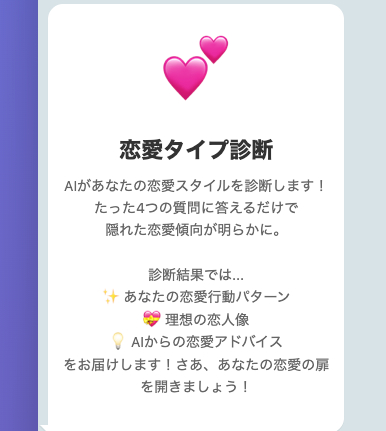 恋愛タイプAI診断ツール - 説明 このWebアプリケーションは、ユーザーの恋愛スタイルをAIが診断するチャット形式のシンプルな診断ツールです。ユーザーはまるでAIと会話... -