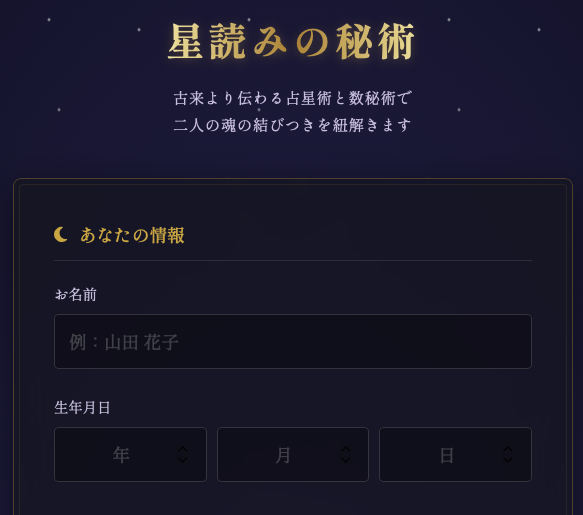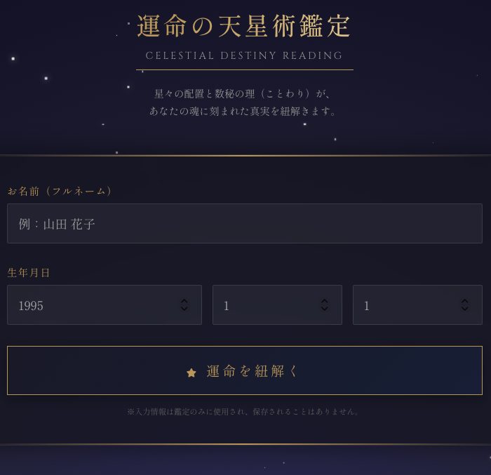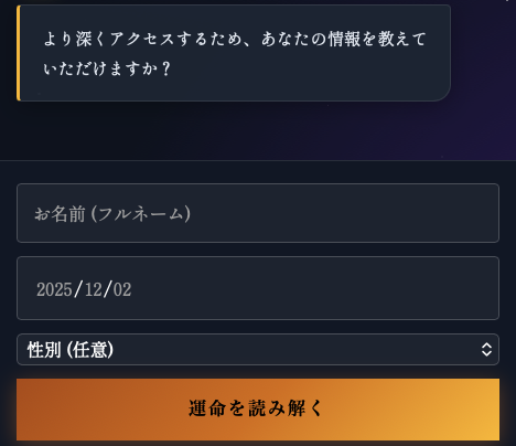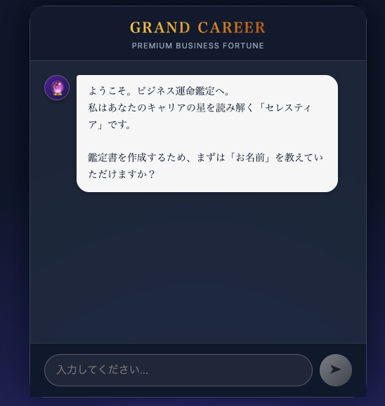 総合運命鑑定 単純な「今日の運勢」ではなく、人生全体を俯瞰(ふかん)する本格的なチャット形式の占いアプリケーションです。お名前(音の響き)と生年月日(星の配置... -