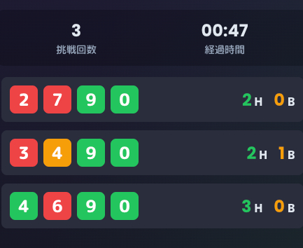ヒットアンドブローのゲーム概要 ヒットアンドブローは、論理的思考力を鍛える本格的な数字推理パズルゲームです。隠された4桁の秘密の数字を、限られた回数で当てるス... -