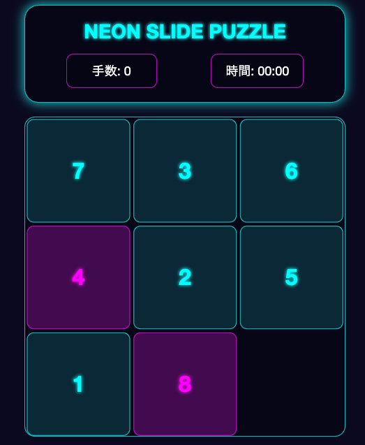 ネオンスライドパズルのゲーム説明 ネオンの光が輝くサイバーな世界へようこそ。「ネオンスライドパズル」は、クラシックな数字並べ替えパズル(スライディングパズル)... -