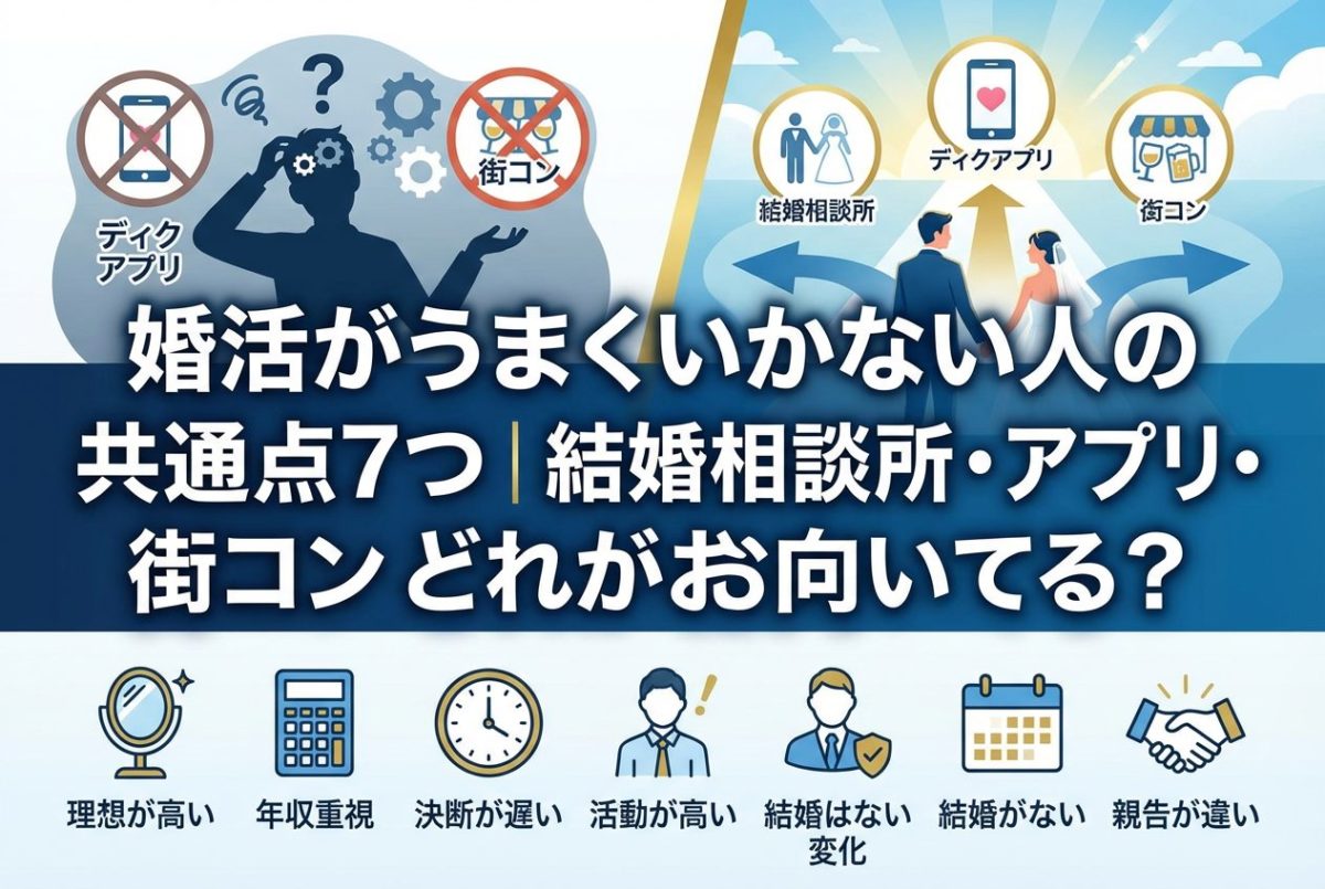 婚活がうまくいかない理由には、本人が気づいていないことが多くあります。以下に挙げる7つの共通点を知ることで、改善のヒントが見つかります。自分に当てはまるものがないか、ぜひ確認してみてください。