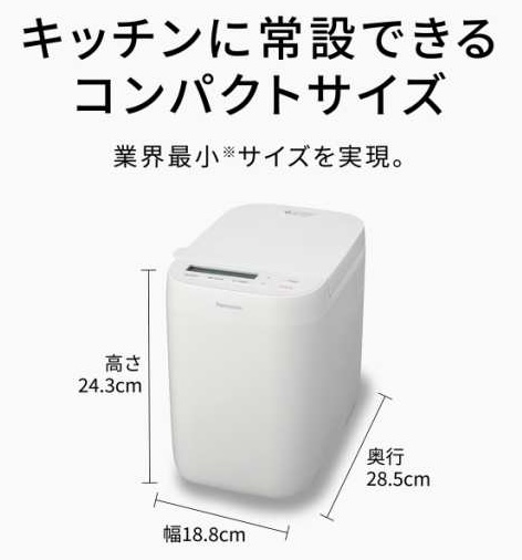 幅18.8×奥行28.5×高さ24.3 cmというサイズは、国内ホームベーカリー市場において、幅×奥行×高さの総合サイズでNO.1の小ささを誇ります。