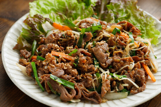 プルコギは朝鮮半島で生まれた伝統的な焼肉料理で、薄切りの牛肉を甘辛いタレに漬け込んで焼いた料理です。