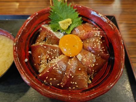 - ご飯の上に盛り付け、半熟卵をのせて完成