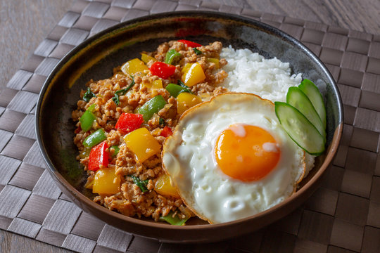 目玉焼きを添えたご飯の上に盛り付ければ完成です。バジルは加熱しすぎると香りが飛ぶため、最後にさっと炒める程度がコツです。