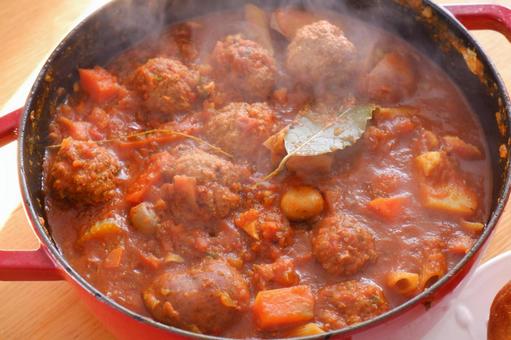 トマトソースに焼いた肉団子を加えます。