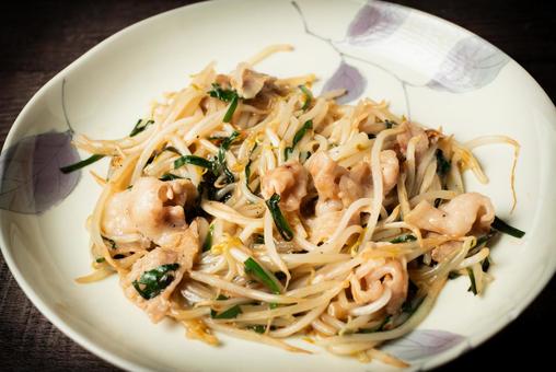 月曜日の献立として、もやしと豚肉のスタミナ炒め、ご飯、わかめのみそ汁、もやしのナムルを用意します。